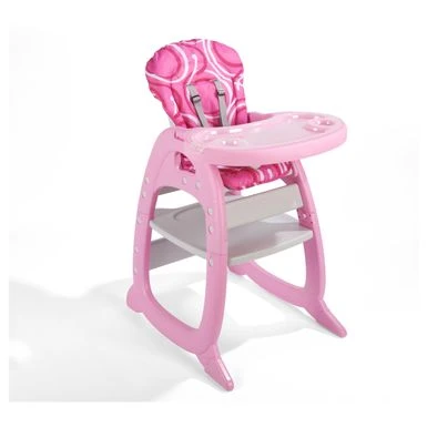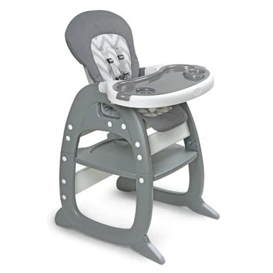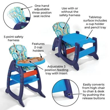Badger Baskets Envee II converts from a fully-featured highchair to a separate table and chair. The fully-adjustable, five-point harness system with quick release buckle ensures that the chair will grow with your child. Badger Baskets Envee II converts from a fully-featured highchair to a separate table and chair. The chair has a three-position tray and three-position reclining seat. The fully-adjustable, five-point harness system with quick release buckle ensures that the chair will grow with your child. Includes caps to cover the corners of the table when the chair is not connected.Â