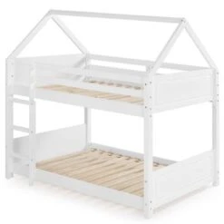 Transform bedtime into an exciting adventure with this cool wood twin bunk bed. Its sloping A-frame roof turns simple bedroom furniture into a fun playhouse where imaginations can run wild. A castle for a princess or a fort for the boys becomes a cozy tent to snuggle under at night. The top bunk is fitted with a guard rail to protect your small ones from tumbles to assure kids will be safe during the night or when they play. This bed will surely make their dreams come true.