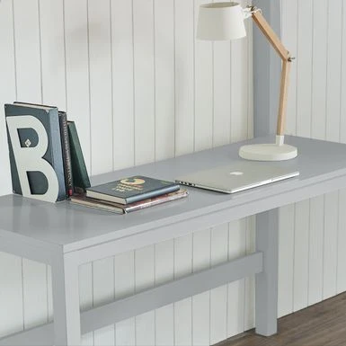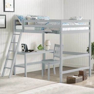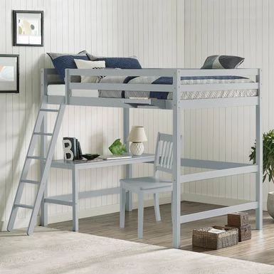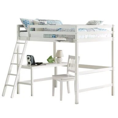 The Hillsdale Kids and Teen Caspian Full Study Loft is the perfect combination of simplicity and style. The simple slat style features a built-in desk under the full size bed, the perfect space for your child to work on homework or special projects and includes a coordinating desk chair that perfectly fits the space. Set includes a hanging night stand that can be used at any end for the bunk bed for any night time needs. The ladder allows easy access for to the top bunk. Featuring a neutral gray or classic white finish, this wood loft is the perfect addition to your kids room. Includes Full-size study loft, built-in hanging night stand and coordinating desk chair. Requires Full-size mattress; not included. Available in Gray and White finishes. Assembly required.
