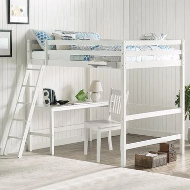 - Traditional and simple slat style wood Full Loft Bed with built-in hanging nightstand and coordinating desk chair