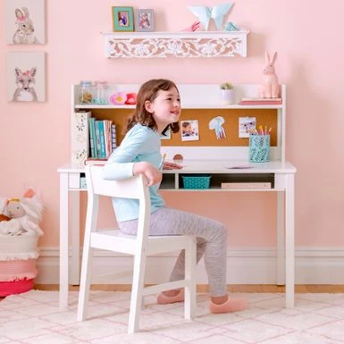Create a productive and engaging study space for your child with the Martha Stewart Kid’s Desk with Hutch and Chair. Made from birch and engineered wood, this durable set offers a large flat workspace, storage shelf, and cord cutout to keep learning materials within reach. The hutch features an upper shelf and corkboard for displaying special treasures and photos. With an ergonomically designed chair included, this desk is perfect for reading, writing, computer work, and crafting. Ideal for ages 5 and up, this desk provides a personal and intentional place to work, learn, and create for years.