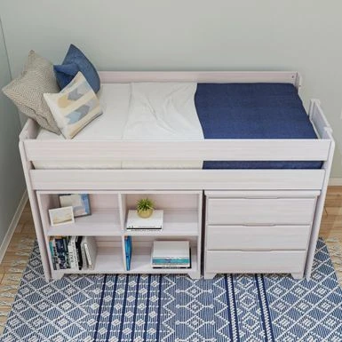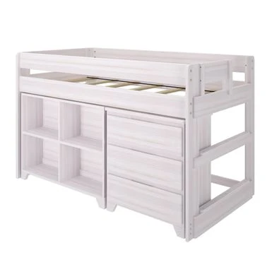 Sleep and store in farmhouse style with the Max & Lily Modern Farmhouse Twin-Size Low Loft Bed with 3-Drawer Dresser and 4-Shelf Bookcase. The solid wood loft bed frame adds superior strength and stability. Sleep and store in farmhouse style with the Max & Lily Modern Farmhouse Twin-Size Low Loft Bed with 3-Drawer Dresser and 4-Shelf Bookcase. The solid wood loft bed frame adds superior strength and stability. This twin low loft bed for kids uses a durable, low VOC finish that is ideal for your clean and healthy kids room. The barnwood textured finishes create a rustic-contemporary look that pairs with your Max & Lily Modern Farmhouse dresser, nightstand and other bedroom set pieces. Because each modern farmhouse piece is applied with a paint dip, variations in color and coating may occur. This loft beds low-profile design Is perfect for smaller rooms and shorter ceilings. The loft bed features tall, 13.5-inch guard rails, so the loft bed safely fits standard mattress sizes up to 7 inches thick. The versatile ladder can be assembled on either side of the loft bed to fit your space perfectly. A 4-shelf bookcase and 3-drawer dresser create space to store everyday items. Flush, color-matched hardware completes the loft bed in style. With solid plywood slats and a metal support bar, the loft bed can support 400 lbs. of resting weight. This low loft bed twin includes easy-to-read instructions, hardware and all the tools you need for a quick setup. 2+ adults are recommended for assembling the loft bed. This loft bed meets or exceeds Federal safety standards for kids furniture. The Max & Lily Modern Farmhouse Twin-Size Low Loft Bed with 3-Drawer Dresser and 4-Shelf Bookcase offers exceptional quality and affordability that kids and their parents will enjoy for years to come. Max & Lily is a member of the Maxwood family of brands the kids furniture experts bringing a tradition of superior quality, safety and fun!