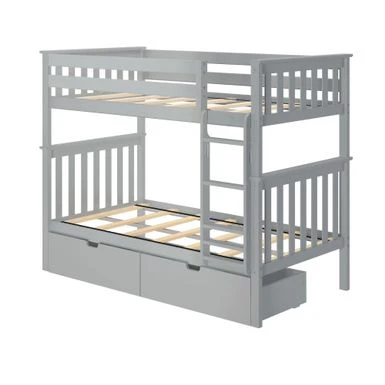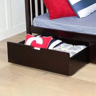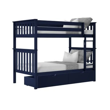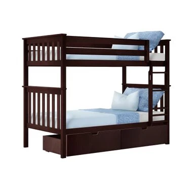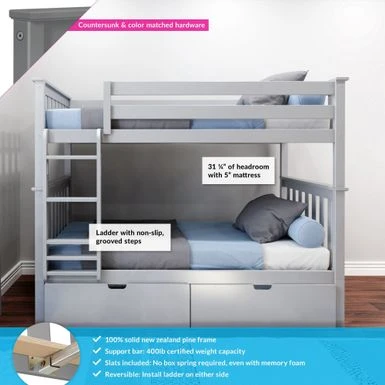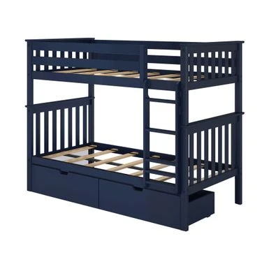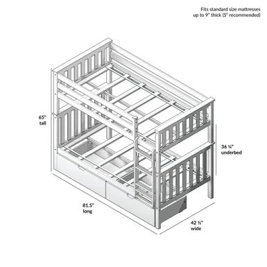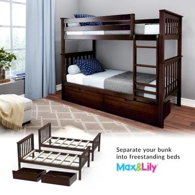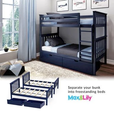 Plenty of room for sleep and play? Now thats a win-win! The Max & Lily Twin Over Twin Bunk Bed with Under Bed Storage Drawers is the perfect combination of functional and fun that both kids and parents love. Plenty of room for sleep and play? Now thats a win-win! The Max & Lily Twin Over Twin Bunk Bed with Under Bed Storage Drawers is the perfect combination of functional and fun that both kids and parents love. Top bunk features tall 14 guardrails, so the bed safely fits standard mattress sizes. Added under bed storage drawers make organizing a breeze. Angled ladder with rounded edges offers comfortable, easy climbing. Added bonus – ladder is both reversible and removable, so it is flexible to work with any space. Solid, knot-free New Zealand pine wood adds strength and stability. All Max & Lily products use a durable, low VOC finish. The slatted head and footboards and flush, color-matched hardware give this bunk bed a clean, modern look. Instructions, upper/lower slat rolls, and required hardware are included. With solid plywood slats and a metal support bar for the top bunk, each sleeping surface can support 400 pounds of resting weight. This bed meets or exceeds Federal safety standards for kids furniture. When its time for play, this bunk beds space saving design frees up plenty of floor space by stacking two sleeping surfaces. 2+ adults make assembly simple and easy. The Twin Over Twin Bunk Bed with Under Bed Storage Drawers from Max & Lily offers exceptional quality and affordability that kids and their parents will enjoy for years to come. Max & Lily is a member of the Maxwood family of brands – the kids furniture experts bringing a tradition of superior quality, safety and fun!