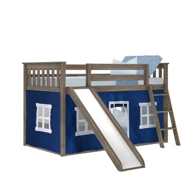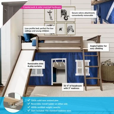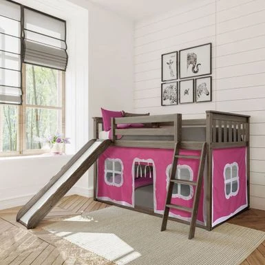 Plenty of room for sleep and play? Now thats a win-win! The Max & Lily Twin Over Twin Low Bunk Bed with Slide & Grey Curtains is the perfect combination of functional and fun that both kids and parents love. Plenty of room for sleep and play? Now thats a win-win! The Max & Lily Twin Over Twin Low Bunk Bed with Slide & Grey Curtains is the perfect combination of functional and fun that both kids and parents love. Only 50 inches high, this space-saving low bunk design is great for smaller spaces and safe for younger children. The bottom bed sits only two inches off the floor, making it the perfect sleep option for little ones. Top bunk features tall 14 guardrails, so the bed safely fits standard mattress sizes. A super fun slide is perfect for playtimes. Angled ladder with rounded edges offers comfortable, easy climbing. Added bonus – the ladder and slide are both reversible and removable, so they are flexible to work with any space. Solid, knot-free New Zealand pine wood adds strength and stability. All Max & Lily products use a durable, low VOC finish. The slatted head and footboards and flush, color-matched hardware give this low bunk bed a clean, modern look. Instructions, slat roll, and required hardware are included. With solid plywood slats and a metal under-bed support bar for the top bunk, each sleeping surface can support 400 pounds of resting weight. This bed meets or exceeds Federal safety standards for kids furniture. When its time for play, this low bunk beds space saving design frees up plenty of floor space by stacking two sleeping surfaces. 2+ adults makes assembly simple and easy. 100% cotton play curtains add even more fun to your room. The Twin Over Twin Low Bunk Bed with Slide & Grey Curtains from Max & Lily offers exceptional quality and affordability that kids and their parents will enjoy for years to come. Max & Lily is a member of the Maxwood family of brands – the kids furniture experts bringing a tradition of superior quality, safety and fun!