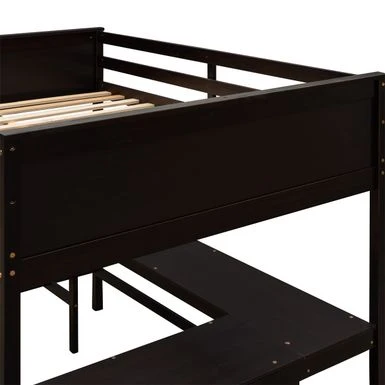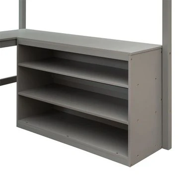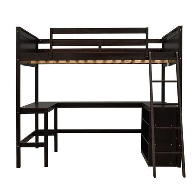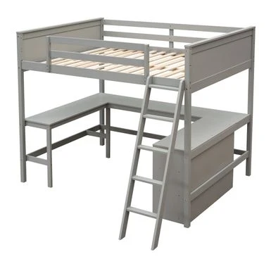 [Maximized space] The loft bed perfectly serves homes with limited space. It takes advantage of the floor space, and allows for a cozy rest, extra work and play space and makes a great piece of furniture for growing families.The entire frame of this bed is made of sturdy pine wood, which is durable and stable in use. [Versatility galore] The space underneath the full size loft bed is a good place for you to read, do homework or play and create their own world to be explored. Coming with bookshelves and desk, the loft bed helps to store books, display decorations, or to place a laptop. [Solid Construction] This muti-functional loft bed is crafted from a solid pine wood frame, with commercial grade MDF board for quality control and durability. The stable ladder can be assembled on other side of the bed. Guardrails are solidly attached for added safety. [Health and Comfort] No box spring required, and without needing a foundation. The wood frame is sturdy and comes with slats for extra support and ensures air moves freely around your mattress to keep it fresh for years to come.- Overall: 79.7″L x 77″W x 68.2″H