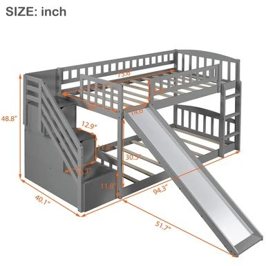 If you need extra sleeping space or you love sleepovers, this Stairway Twin-Over-Twin Bunk Bed with Drawers and Slide is perfect for your home. The build-in ladder and staircase provide easy access to the top bed, and the two drawers located beneath the attached staircase provide ample storage for your toys and bedding. For added extra fun, slide is included and can be put either left or right. The 14.9″ tall guardrails to keep your safe on the top bunk. High-quality, solid pine legs and a strong, durable frame ensures stability and durability for long-term use. Slat kit included so box springs are not required. This bunk bed is designed with a clean silhouette and a hue of elegance. It suits all styles of home decoration, and completes the look of any bedroom.