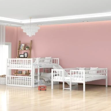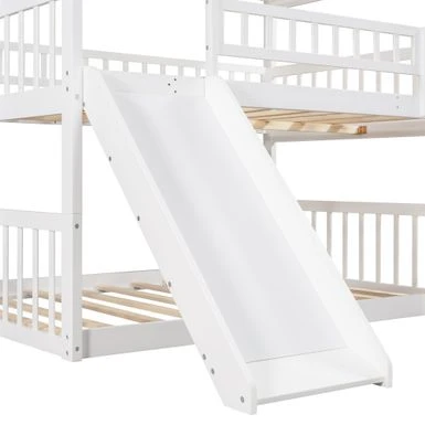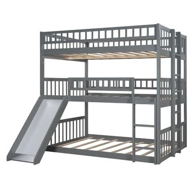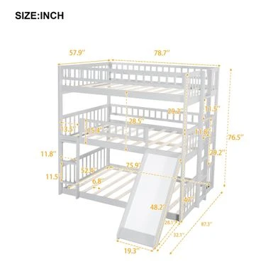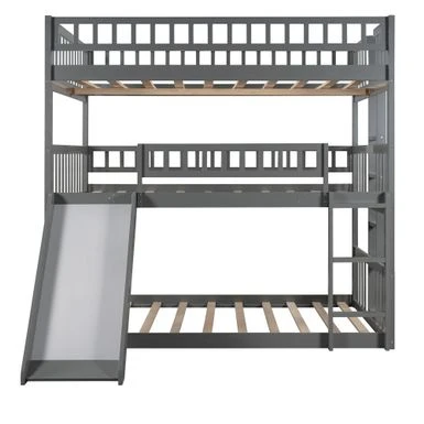 - [Convertible Ladder and Slide] With two built-in ladders, it is easy for children to climb up and down from the upper and middle bunks. Featuring a low slide for kids to play, this triple bunk bed can add fun to children and develop their sense of balance and coordination. The slide and the short ladder are convertible, both of them can be put left or right.