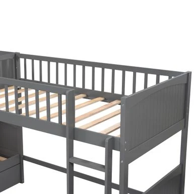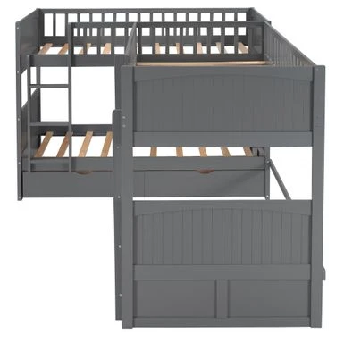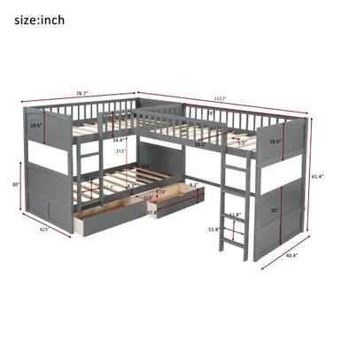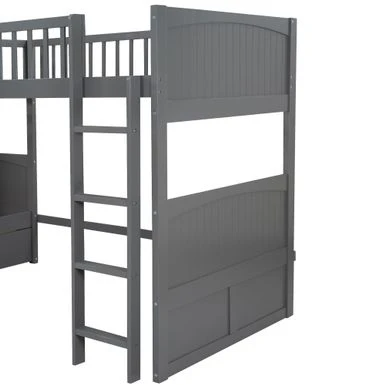 This bed increased sleeping capacity is the perfect solution for cottages, extended family, out-of-town guests, or hosting your childs rambunctious friends for a sleepover. The Triple Bunk Bed offers space-saving design with two traditional height bunk beds and an attached loft bed, configured to fit in the corner of the room. Two drawers under the bunk. Featuring clean lines, horizontal slats, and built-in stepladders to access the top bunks, the unique bunk bed design offers both durability and functionality. Whats more, the clearance space under the loft bed can be used as a fun area to play with the place or as a versatile spot to set up a little study corner for your kids!