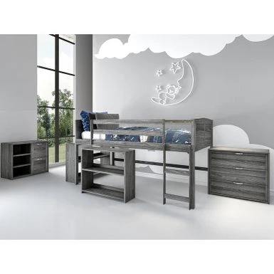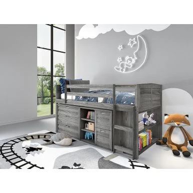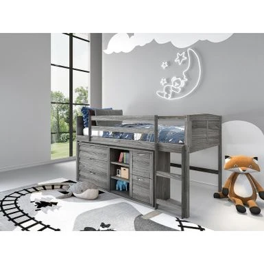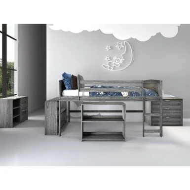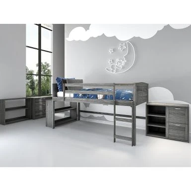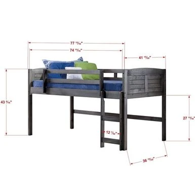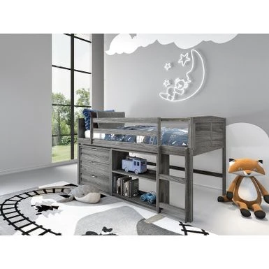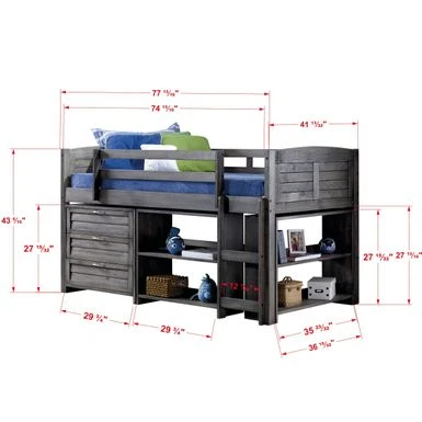 Upgrade your child’s bedroom with the Taylor & Olive Dardanelle Grey Wood Twin Low Loft Bed. This bed features a modern and contemporary style, made of high-quality Brazilian pine wood with a weathered antique grey finish that adds a touch of sophistication to any room. The elevated twin bed provides ample space underneath for storage, playtime or creating a cozy reading nook. The foot ladder on one side allows easy access to the bed while the multiple integrated drawers and shelves offer plenty of storage and display space for toys, clothes, books, and decorative accents.