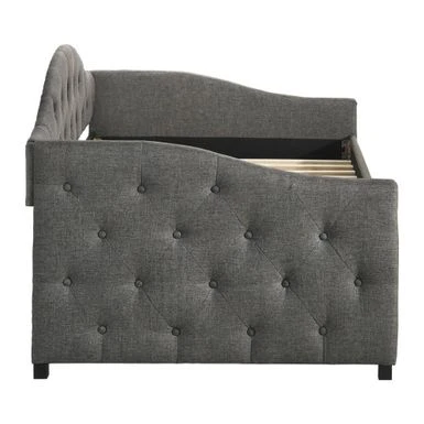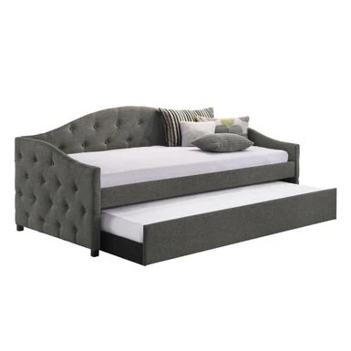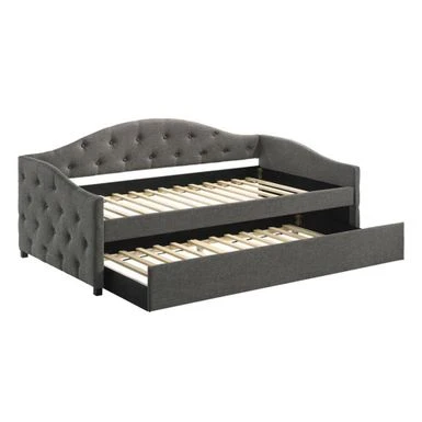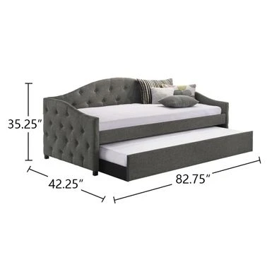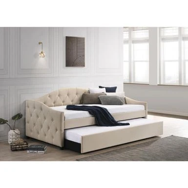 Maximize your space without sacrificing style with this elegant twin daybed and trundle set. Featuring sweeping lines, button-tufted back and sides, and a graceful camelback, this daybed is wrapped in a soft and versatile fabric that complements any color scheme. Perfect for compact rooms, the hidden trundle set provides additional sleeping arrangements that are easily retrievable and concealed by a smooth padded panel.